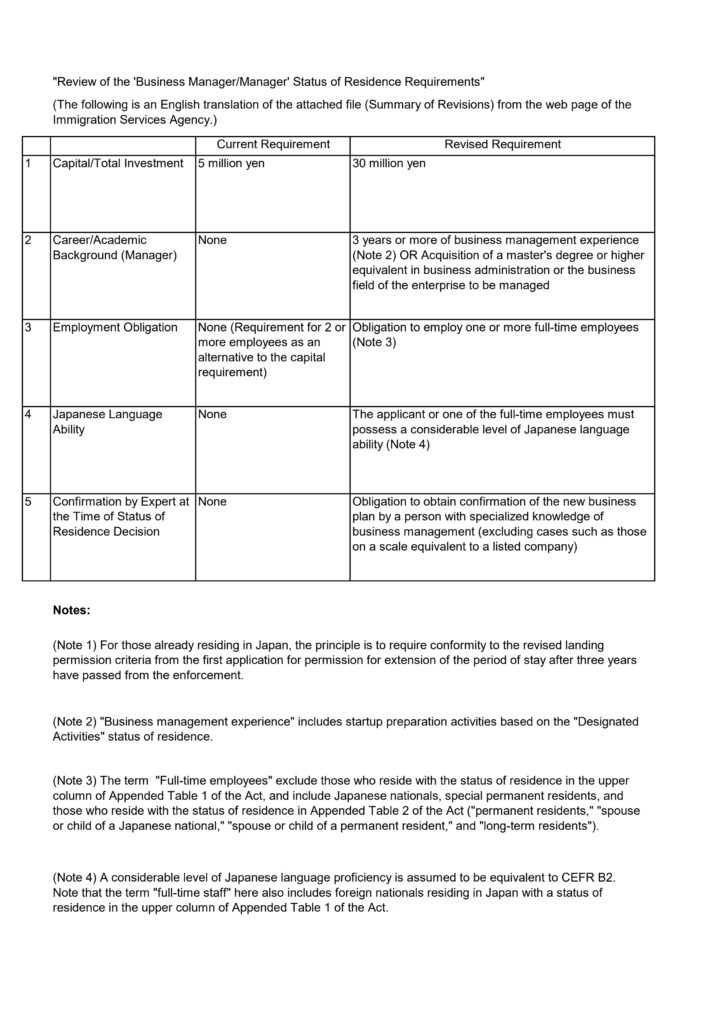 (This is the English translation of the attached file (Guidelines for the Revision of the Permission Criteria for Business Manager Status of Residence) from the web page of the Immigration Services Agency.)